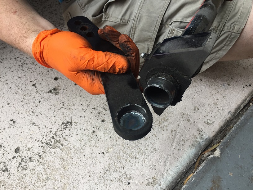 It’s not very clear in this picture, but the arm I grabbed (far side in the picture) rotated down and the rest of the swaybar stayed where it was. The welds holding the arm to the bar has sheared clean through. Since the arm has a hole bored through it that slips over the cross-tube everything still looked normal, but the arm was just pivoting on the tube and transmitting exactly zero torque to the opposite side. These pictures show the problem: