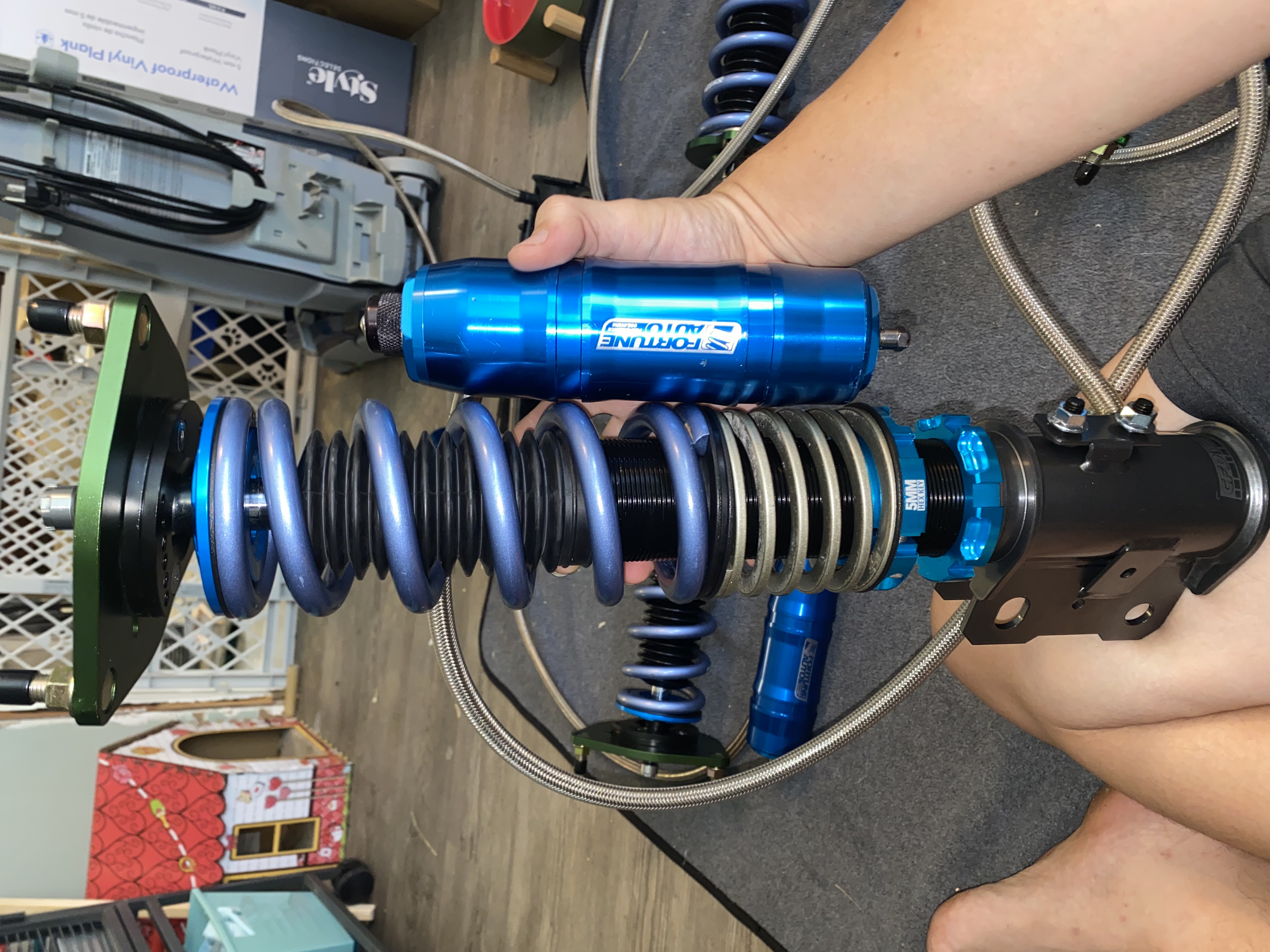 First, replacing my coilovers which are 1 way, to the 2 way version. They’re Fortune Auto Pro 2 Way which is the same company that my current coilovers are. I got 2nd hand but I had them ship them to Fortune Auto to get them rebuilt. Got them today and they’re purty. I think my biggest hassle will be trying to figure out where to mount the rear external canisters. I really don’t want to mount them on the outside, prefer to somehow get the external canisters in the rear. Read I may have to drill a hole for the canister and get some grommets.