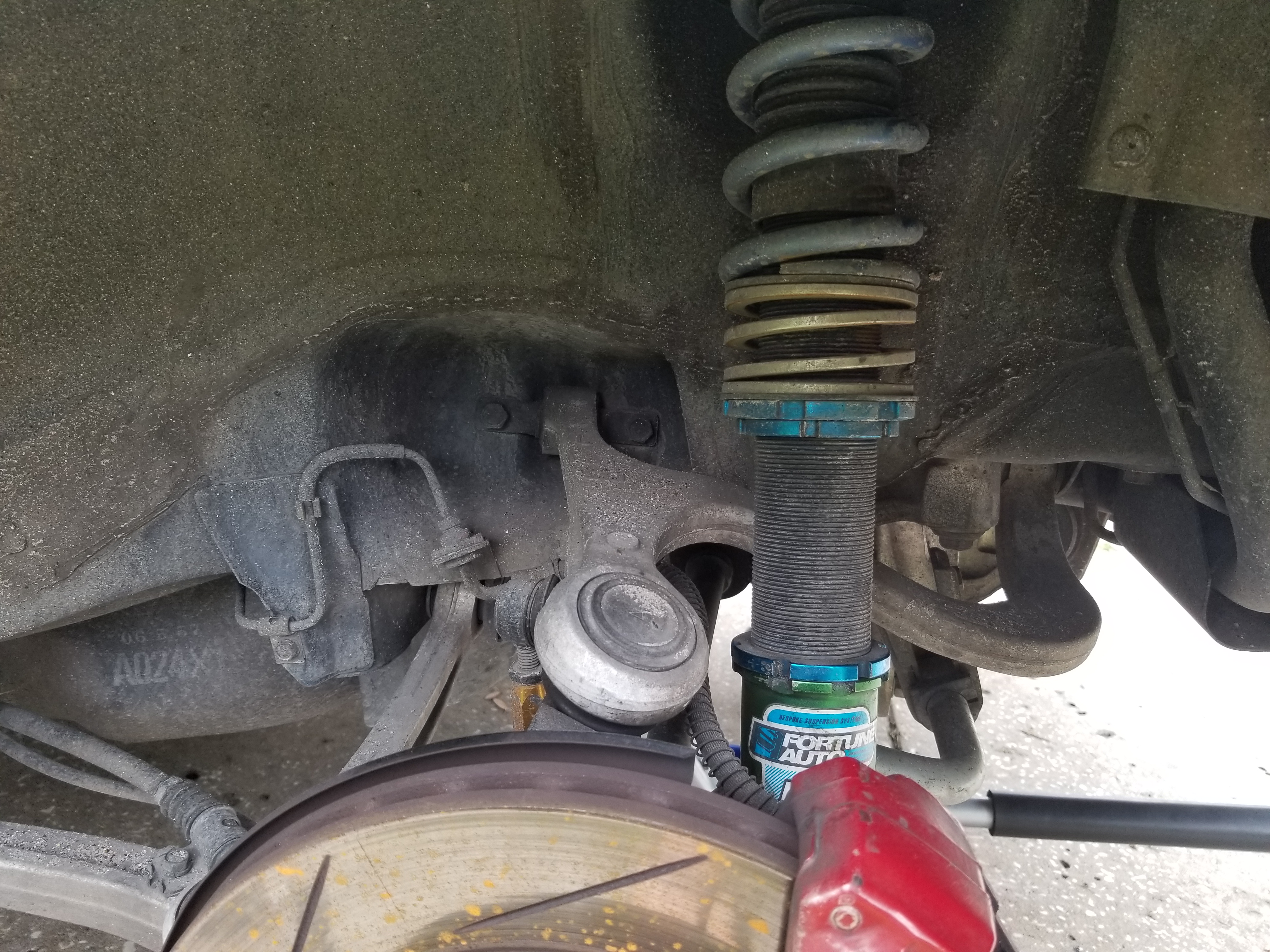 Putting the control arms back in was a PITA. The rear bushings wouldn't go in between the metal slot where you would bolt it down. I had to basically Jeremy Clarkson it and use a hammer to widen the space to fit the control arm in where the new bushings are. Once the rear bushing got in where they needed to be, the control arm where the front bushing is wouldn't slide into the area where it bolts into. I'm assuming the offset made this a lot harder compared to no offset. I had to hammer some more stuff to get that fitted. Basically was like that for both sides. Also had one problem with one ball joint getting the bolt to slide in freely when the ball joint stud is attached to the knuckle. For some reason the little crevice wasn't lined up 100% so it had a very small lip. It would require me to spin the stud a very very small amount but that sucker would not spin. I basically hammered the ball joint bolt to in very slowly, pulled it back out to see if it was stripping any threads and it did a very very small amount so I yolo'd it and tapped it in. Seems like it worked fine and was able to attach the nut onto the ball joint bolt(wouldn't recommend that method to anyone but didn't know of a way to spin the balljoint stud slightly?)