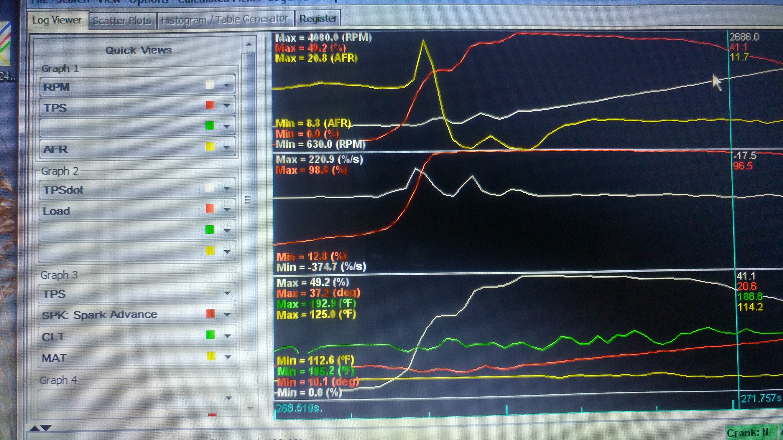 You may be misinterpreting "load" in this context. I don't know why they label it that. One of the first things I do when I start playing is change that to "MAP". MAP is manifold pressure measured in kPa and is DIRECTLY related to throttle position. If you're NA, the more you open the throttle, the closer manifold pressure gets to the atmospheric pressure of 100-101ish. If you're boosted, obviously, it can go higher.Native wrote:What you can see is that as soon as I open the throttle, load goes right up, and the AFR goes way lean, like almost 20:1, then goes super-rich, like 9:1, then comes up to the expected 12ish as I accelerate away from the hump.