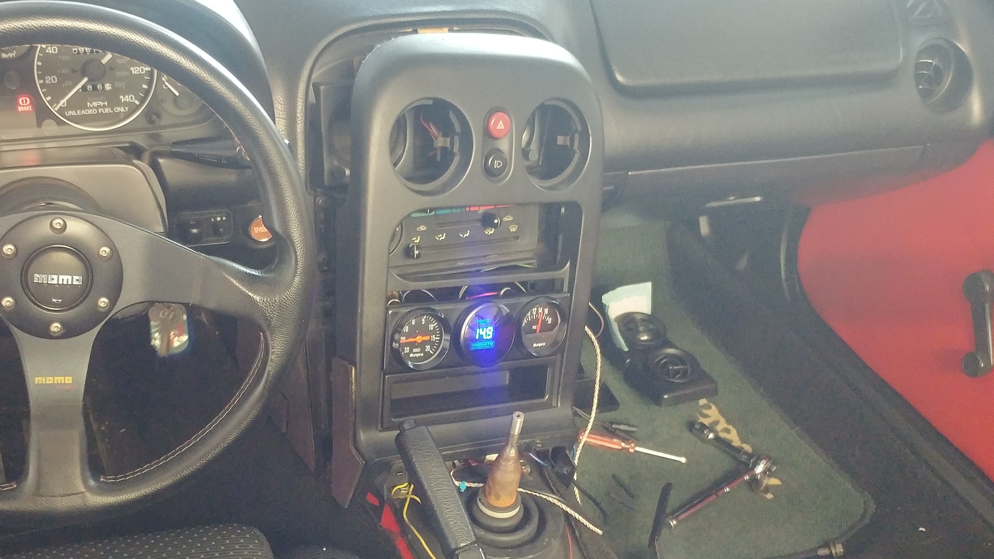 Yeah, big deal - gauges in a Miata. But I'm pleased. Electrics is my weak point, I'm a crappy solderer, but I managed, all the joints are heatshrinkwrapped, and it all worked at the first turn of the key (and kept working). And, good vacuum and the charging system is healthy. No surprises on AFRs with the stock ecu.