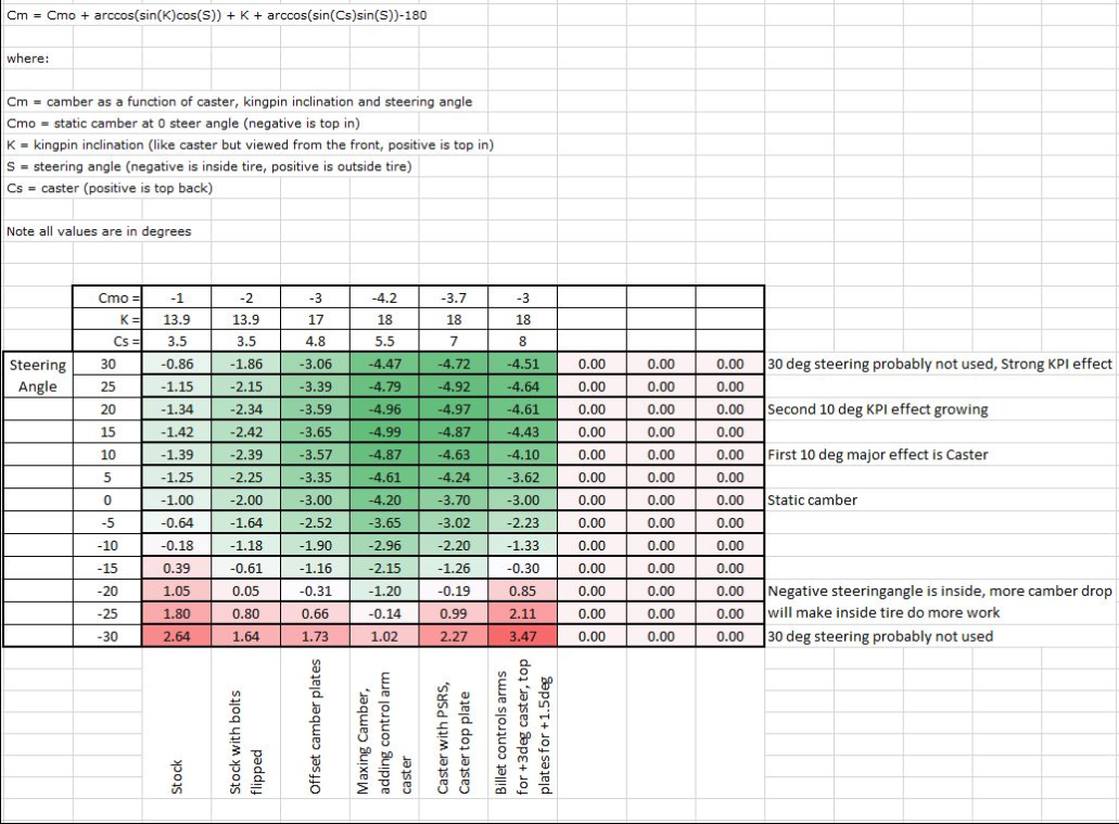 But, what about Caster? We don't talk about it much. The general wisdom is "run as much as you can get". Again, on a street car, that's almost universally true because within the factory alignment range, we can't get "too much" caster. So, if you want the short answer: Run max caster, but don't sacrifice camber to get caster. (on some cars with fully adjustable alignment, you do have to make that choice to give up some caster to get more static camber) If your car has manual steering or steering that otherwise already feels "heavy", you'll want to continue reading.