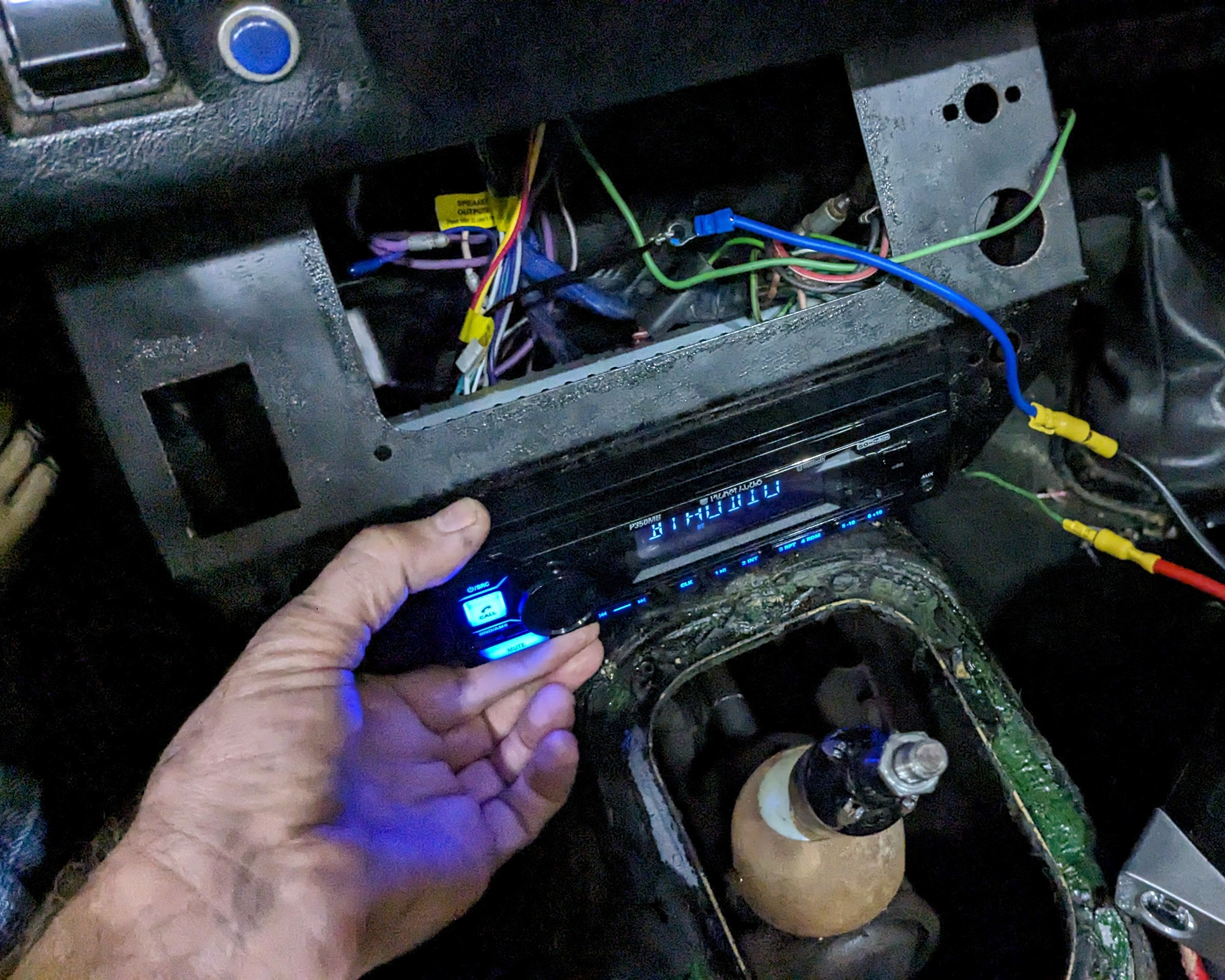 Carefully tucked the wiring, and stuck the speaker assembly in place. (it covers up a lot of things, like the hazard light switch connector, so it has to go in last) Crammed the console back in place. Refitted the shift lever. Spent 5 minutes looking for the damned shift knob. It was under the passenger seat, of course.