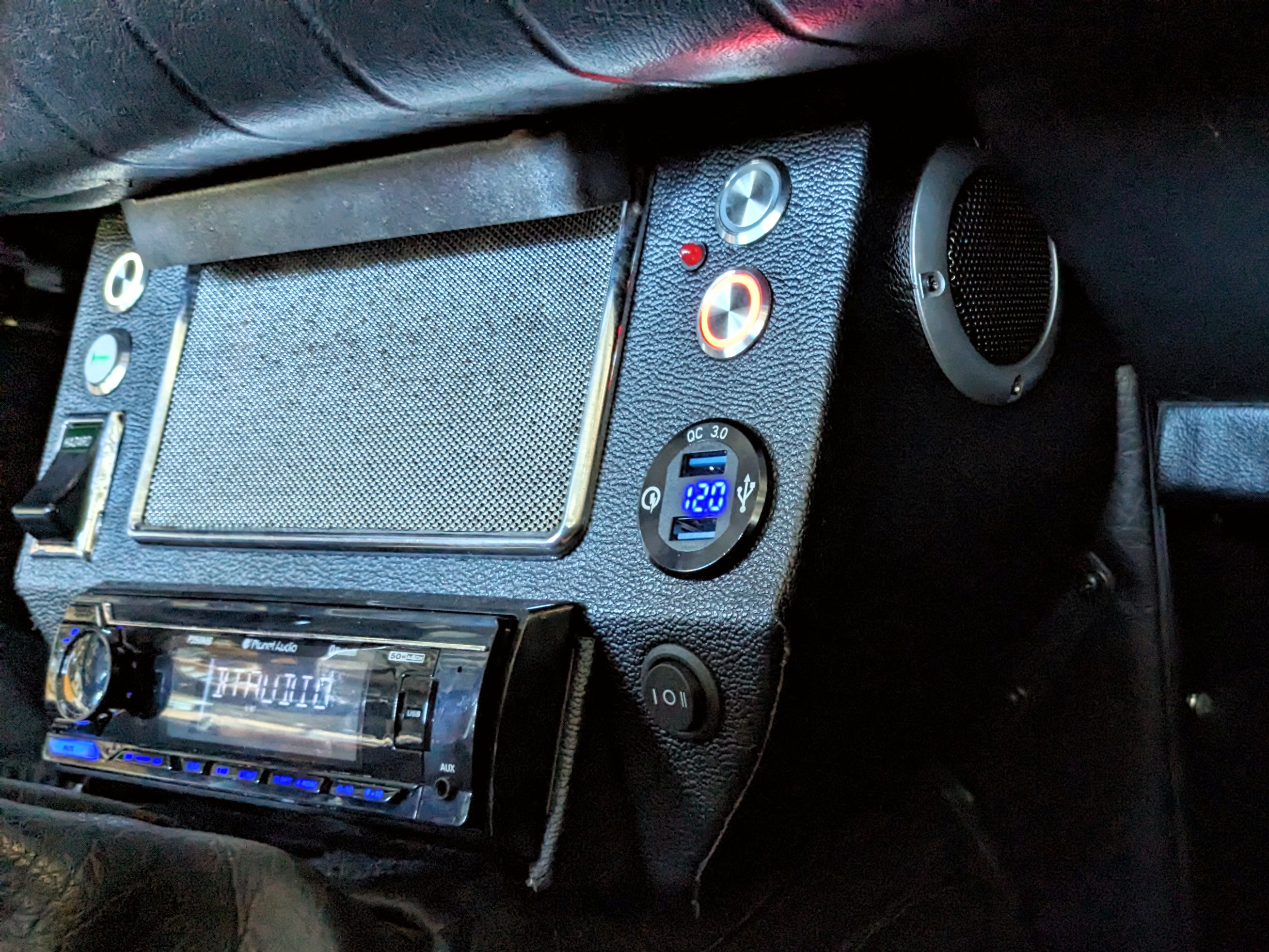 5. Interior lights. That's what I just spent 3 hours looking into. Ordered a 12v LED "hardscaping" light. It's got a mounting plate that's supposed to fit in between bricks on a retaining wall, and the light itself is 7" long and about 3/4" x 3/4". That'll fit neatly above the speaker grille bolted to the top of the console and I'll be able to bend the bracket to get the angle of the light just right. It's powder-coated bronze, so I'll have to paint it black to match the console. Shouldn't be the eyesore that the original light was. And I'll put a switch for it somewhere on the panel. (also controlled by the door switches... which I'll need to clean at some point because they are flaky) I also got a pair of tiny panel-mount single LED "driving lights" to use as footwell lights. They'll go in the sides of the console. It angles inward at the bottom, so that will point the lights downward so that they aren't blinding. And they're flush-mount with tidy black aluminum bezels. They'll look nice and not intrude on knee space. So, those are on order.
